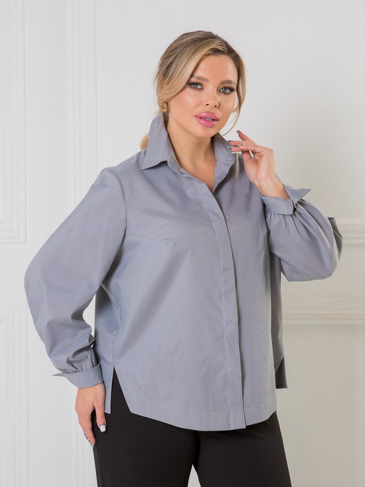 Оригинальная повседневная блузка, свободного силуэта, выполнена из неэластичной плательной ткани. Блузка по переду с двумя нагрудными вытачками и супатной застежкой на петли и пуговицы. Спинка с отрезной кокеткой, по середине спинки в шве притачивания кокетки заложена бантовая складка. Горловина переда и спинки с втачным отложным воротником на стойке. Рукав втачной длинный с притачным манжетом по низу и сборкой по шву притачивания манжета. Манжет с застежкой на петли и пуговицы. Длина рукава от плеча в 50 р-ре – 60 см. в 64 р-ре – 63 см., ширина рукава по низу в 50 р-ре – 22 см. в 64 р-ре – 25 см.В В Низ блузки фигурный с разрезами в боковых обработан обтачкой. Длина разрезов 11 см. Блузка без подклада. Длина изделия по спинке в 50 р-ре – 65 см. d 64 р-ре – 71 см.