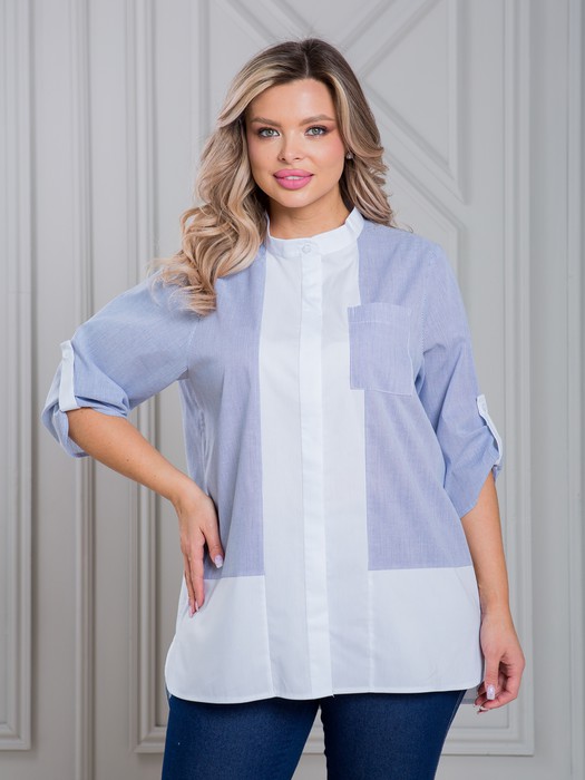 Оригинальная повседневная блузка-рубашка, свободного силуэта, выполнена из сорочечной ткани в сочетании 2-х цветов. Блузка по переду с супатной застежкой. Перед с отрезными нижней и средней частями. На левой стороне блузки небольшой накладной карман. Спинка с отрезной нижней частью горловина переда и спинки с воротником-стойка. Рукав втачной, длиной 3/4 с патой по низу. Пата с застежкой на петлю и пуговицу, позволяет регулировать длину рукава. Длина рукава в 50 р-ре – 43 см. в 62 р-ре – 46 см., ширина рукава по низу в 50 р-ре – 34 см. в 62 р-ре – 40 см. Низ блузки фигурный, спинка длиннее переда на 5 см. Блузка без застежек и подклада. Длина изделия по спинке в 50 р-ре – 80 см. в 62 р-ре – 86 см.