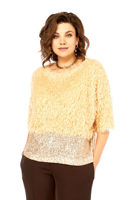 Блузка нарядная прямого силуэта, из интересной ткани с бахромой и отделкой из паеток. Вырез горловины округлой формы, со спущеныным рукавом длиной 3/4