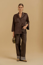 Блузка из хлопковой ткани свободного силуэта. Рукав реглан, длинный, широкий, длина регулируется интересной кулиской с завязками, низ обработан бейкой. Горловина блузки обработана широкой бейкой, переходящей в декоративные детали, которые можно завязать. В верхней части по пореду заложена сборка. Низ блузки фигурной формы.
