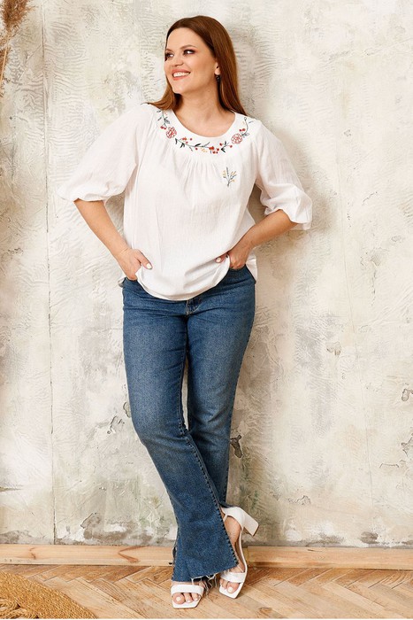 Блузка прямого силуэта, из хлопковой ткани. Блузка с круглым вырезом горловины и широкой планкой на которой расположена, авторская вышивка, в блузке боковые швы перехоят на деталь переда и заканчиваются разрезами, с не большим перепадом длины, перед короче, спинка длиннее. Спинка на широкой обтачке. Рукава полуреглан, расширенные, линия низа на резинке, длина 3/4. Блузка- это тренд на все время, она относится к базовой части гардероба. С помощю блузки можно создавать интересные образы на каждый день, можно носить, с джинсами, шортами, хлопковыми брюками.