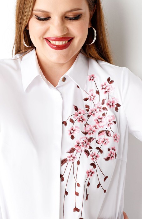 Стильная молодежная блузка с дизайнерской вышивкой по переду и по рукаву. Такая блузка отличный вариант как для офиса, так и на каждый день. Блузка полуприлегающего силуэта слегка расширенная к низу, по бокам имеются небольшие разрезы. Блузка с центральной сквозной застежкой на потайные петли и пуговицы и одну декоративную пуговицу на стойке воротника. По переду имеются нагрудные вытачки, по спинке имеется кокетка. Рукава длинные с манжетами. На манжетах имеются декоративные петли и пуговицы. Такая блузка отлично сочетается с различными брюками и джинсами создавая стильный современный образ.