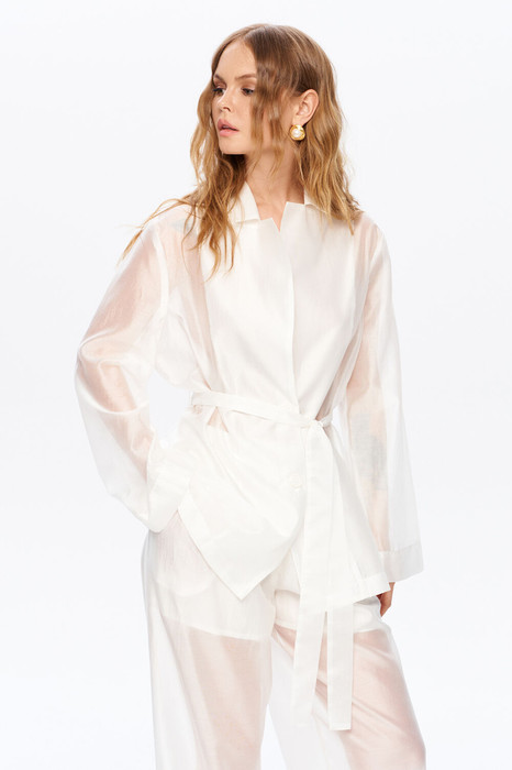 Детали: блуза прямого силуэта, застежка на петли и пуговицы, рукава втачные длинные с высокой подгибкой, съемный пояс, без подкладки.