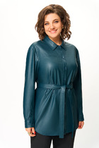 Детали: блуза приталенного силуэта, перед и спинка свободного покроя, пояс блузы со сборкой, расширенные плечи, сборки по плечам и горловине, застёжка на потайную молнию в боковом шве, воротник стойка со сборкой и застёжкой на навесные петли и пуговицы, втачные расширенные к низу рукава с резинкой по низу.