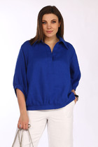 Детали: блуза приталенного силуэта, перед и спинка свободного покроя, пояс блузы со сборкой, расширенные плечи, сборки по плечам и горловине, застёжка на потайную молнию в боковом шве, воротник стойка со сборкой и застёжкой на навесные петли и пуговицы, втачные расширенные к низу рукава с резинкой по низу.