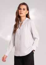 Детали: блуза прямого силуэта, V-образный вырез горловины, воротник-волан, низ рукавов на эластичной тесьме с воланами, завязки по переду.