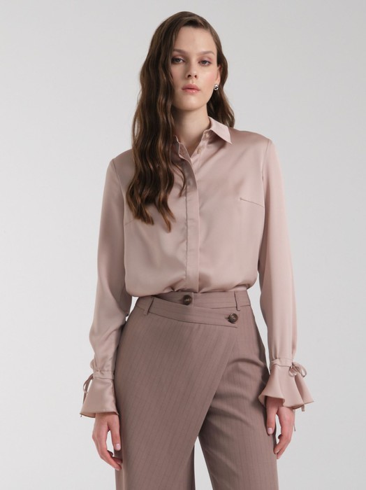 Модель полуприлезающего силуэта, с фигурной линией низа. Спереди центральная потайная застёжка на петли и пуговицы. Воротник сорочечный. По низу рукава кулиса с завязками и волан.