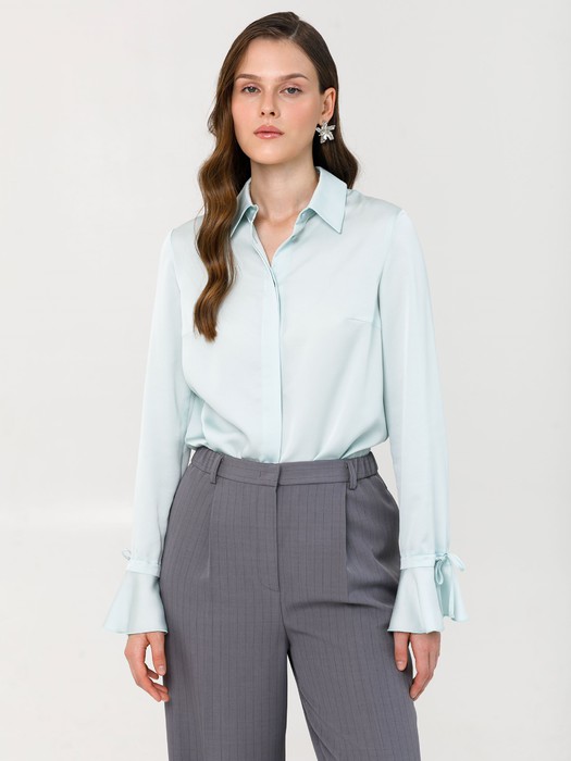 Модель полуприлезающего силуэта, с фигурной линией низа. Спереди центральная потайная застёжка на петли и пуговицы. Воротник сорочечный. По низу рукава кулиса с завязками и волан.