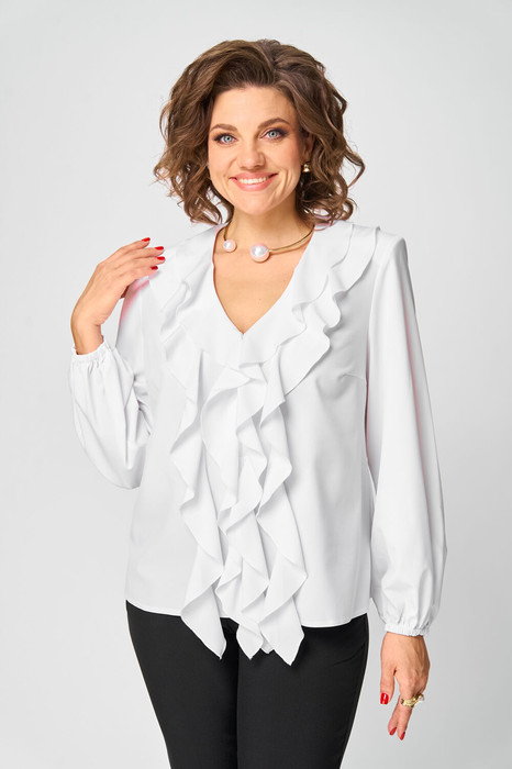 Блузка женская прямого кроя с втачным рукавом. Вырез горловины v- образной формы, оформлен двумя рядами воланов переходящими в шов по переду. По линии груди вытачки. Спинка цельная. Рукав длинный расширенный к низу собран на резинку.