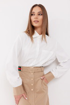 Блузка женская прямого силуэта. Рукав длинный с манжетой. Застежка на петли и пуговицы. По переду и спинке кокетки. Воротник стойка переходящая в завязку, образуя бант или узел. Длина вдоль середины спинки от шва втачивания воротника - 61,5 см. Длина рукава 61 см.