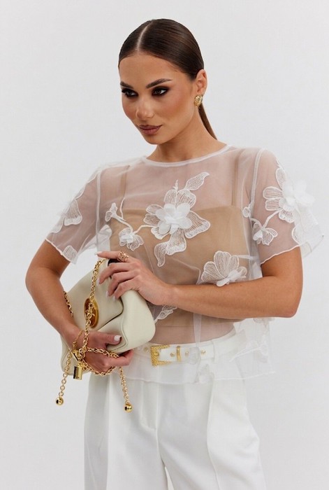 Блузка женская прямого силуэта из фактурной ткани «цветы на сетке», по горловине спинки застежка на декоративный крючок, рукав короткий, горловина круглой формы. В комплекте нижний топ-бандо на бретелях из эластичного трикотажного полотна.