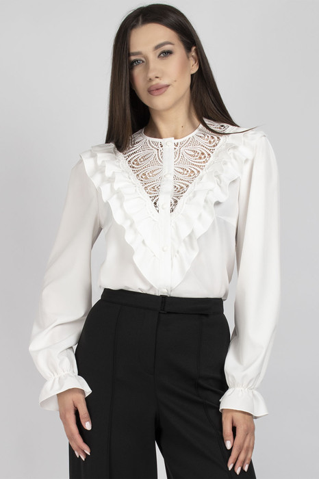 Визитная карточка этой блузки - это ее перед, украшенный двойными рюшами, а также кокетка выполненной из ажурного кружева. Именно благодаря этому отделочному элементу блузка приобретает особую элегантность и изысканность, становясь непременным атрибутом нарядного образа.