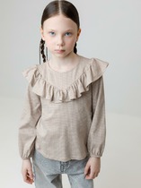 Трикотажная блуза из линейки VAY KIDS школа. Отложной воротничок с застежкой на пуговицы и ажурной отделкой.