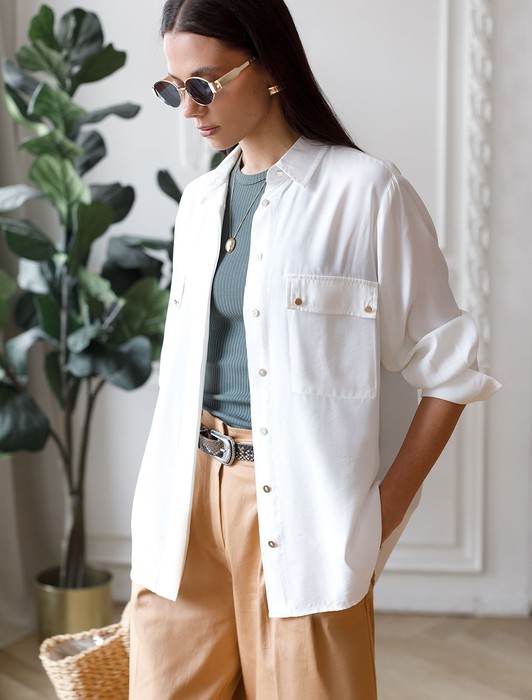 Состав: 55%Вис 45%Лиоцелл (Вис)Блузка с имитацией карманов и удлиненными манжетами выполнена из премиальной вискозы и лиоцелла. На спинке изделия фирменный логотип бренда. Имитация карманов позволяет этому элементу выглядеть аккуратно без складок и фалд, которые вероятны на такой пластичной ткани.Застежка на золотистые пуговицы. Приятная на ощупь ткань охлаждает кожу в жаркую погоду. Отлично впишется в нестрогий офисный дресс-код или в расслабленном повседневном образе с джинсами.