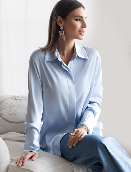 Состав: 94%ПЭ 6%ПУ Плотность: 107 Г/м2 Параметры модели на первом фото: Рост 170, бюст 89, талия 63, бедра 92 Размер товара на первом фото: 42Сатиновая блузка с эластаном в голубом цвете – воплощение элегантности и комфорта. Благородный блеск сатина добавляет образу шика, а эластичность материала гарантирует удобство при носке. Прямой силуэт блузки обеспечивает комфорт, а эластичность материала предотвращает деформацию. Застежка-планка с потайными пуговицами придает модели аккуратность. Универсальный вариант для casual-образов.