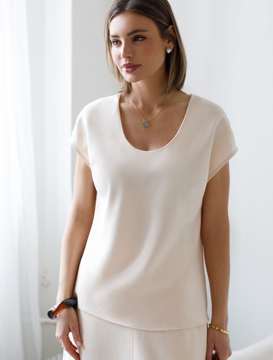 Состав: 76%Лиоцелл (Вис) 24%ПЭ Плотность: 180 Г/м2Элегантная блузка кокосово-молочного цвета скроенная по косой выполнена из плотного лиоцелла. Лиоцелл это более дорогой и экологичный вариант вискозы, очень прочный и шелковистый. Эта повседневная блузка с трендовым U-вырезом создана для легкого и утонченного стиля. Мягкие линии кроя создают невероятно эффектный образ, который подчеркивает естественную красоту, не стесняя движений, а свободный фасон дарит ощущение абсолютного комфорта и уверенности. Блузка красиво драпируется при движении, создавая летящий, воздушный эффект. Эта легкая блуза с коротким рукавом идеальный выбор для комфорта и стиля в теплое время года, она будет идеальна для любого повода.