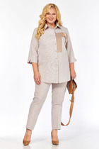 Блуза (рубашка) женская из тканого синтетического полотна с набивным рисунком, свободного покроя, с V- образным вырезом горловины, короткими втачными рукавами, центральной бортовой застежкой на обметанные петли и пуговицы. В боковых швах разрезы, по низу рукавов манжеты, горловина обработана обтачкой.