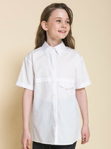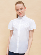 Блузка для девочки из трикотажного полотна с коротким рукавом-фонарик со сборкой по окату и нижнему срезу рукава. Вырез горловины округлый, оформлен кружевной тесьмой.На полочке декоративная планка.