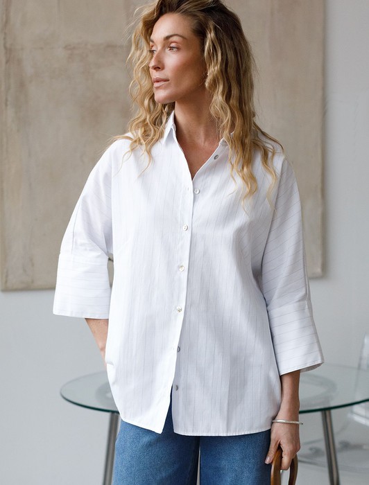 Состав: 65%Хлопок 26%ПЭ 9%Лен Плотность: 104 Г/м2Стильная блузка белого цвета в лавандовую полоску идеально держит форму и подчеркивает любую фигуру. Свободный крой с цельнокроеным рукавом 3/4 создает эффект легкой непринужденности и комфорта, а манжеты на рукавах добавляют аккуратности и завершенности образу. Отложной воротник придает блузке классическую нотку, которая гармонично сочетается в деловом образе. Хлопок с добавлением льна гарантирует отличную посадку, подчеркивая достоинства и скрывая недостатки, при этом сохраняет свежесть на протяжении всего дня. Такая рубашка станет великолепным выбором для тех, кто ценит удобство и стиль одновременно. Модель удачно сочетается с различными предметами гардероба, позволяя создавать стильные и практичные образы в любую погоду.