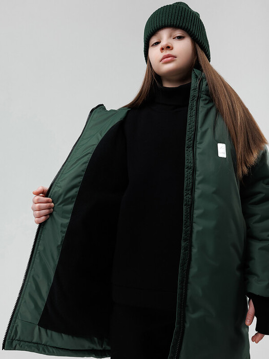 Пальто для детей школьного возраста, утеплённое на подкладке, прямого силуэта, с центральной застёжкой на тесьму -молния. Рукава реглан с притачной удлинённой манжетой с отверстием под палец. Капюшон со вставкой и с цельнокроеной стойкой. На полочке расположены карманы листочки с молнией. Материал верха: мембранная ткань 100% полиэстер, утеплитель Hetta micro 150 г/кв.м, утеплитель в капюшоне Hetta micro 100 г/кв.м, подкладочный материал флис 100% полиэстер. Мембрана 3000 мм/3000 г/кв.м, флис 130 гр. Температурный режим от 0 до -10 градусов, в зависимости от индивидуального теплообмена.
