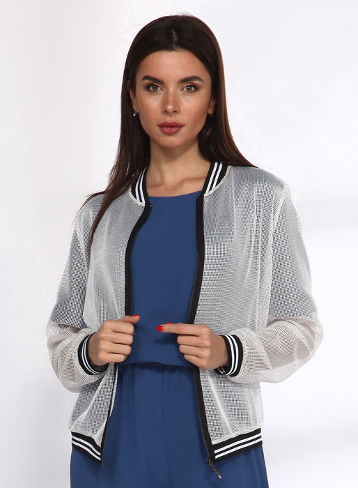 Бомбер спортивного стиля, выполнен из ултрамодной турецкой сетки. Перед бомбера с застежкой молнией. Рукав втачной, длинный. Горловина, манжеты и низ бомбера выполнены из контрастного довяза.