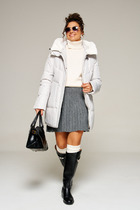 Бомбер приталенного силуэта, обработан подкладкой. Отрезной по линии талии, декорирован баской из органзы. Рукава длинные втачные, двойные: внутренняя часть выполнена из экокожи, внешняя обработана органзой, присборенной для пышности. Низ изделия обработан баской, собранной в складку. Перед обработан отлетными кокетками, растегиваются на разъёмные молнии. Застёжка — разъёмная молния по центру переда лифа, по низу вшиты шлёвки и съёмный пояс из основной ткани, дополнен металлической пряжкой.