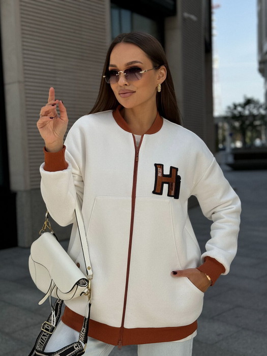 Рукава втачные, одно шовные. По низу рукава притачные манжеты из отделочной ткани. Воротник стойка с закругленным концом из отделочной ткани. Бомбер на подкладке.