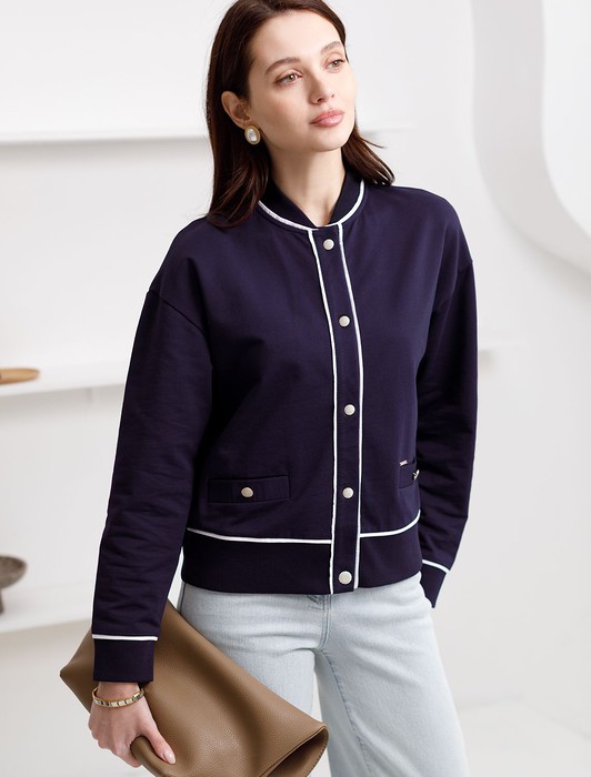 Состав: 95%Хлопок 5%ПУ Плотность: 240 Г/м2Бомбер темно-синего цвета среднего объема с застежкой на пуговицы выполнен из премиального футера двухнитки плотностью 240 Г/м2. Натуральный состав ткани обеспечивает дышащий эффект, мягкость и приятные тактильные ощущения, Эластичный материал позволяет свободно двигаться без стеснения, а также отлично сохраняет форму даже после длительного ношения. Гладкая лицевая сторона придает бомберу опрятный и дорогой вид. Повседневный бомбер отличается аккуратным силуэтом без лишнего объема и универсальной длиной, которая идеально подходит для повседневного образа. Особенность бомбера - контрастные полосы на горловине, манжетах, поясе и вдоль застежки, которые добавляют современный акцент и делают его более выразительным. Представленная размерная линейка позволяет подобрать оптимальный вариант для любой фигуры и размера, на маленький или плюс сайз, обеспечивая свободу движений без компромиссов по стилю. Этот легкий бомбер станет отличным дополнением к базовому гардеробу, сочетая практичность с элегантностью
