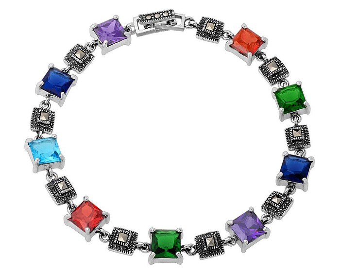 Вес: 13.52 г Вставка: Марказит Цвет камня: Микс Производство: Таиланд Покрытие: Оксидирование Количество: 11Браслет, арт.656342 Серебро Серебро 925, р. 19.5, 13,52 гр., марказит , синт.аметист , синт.изумруд , синт.рубин