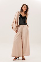 Льняные брюки с контрастным шнурком. Изделие с высокой посадкой и эластичной деталью в поясе. Для практичности предусмотрены вместительные карманы. Легкий материал и простой крой обеспечат максимальные комфорт в жаркие дни.
