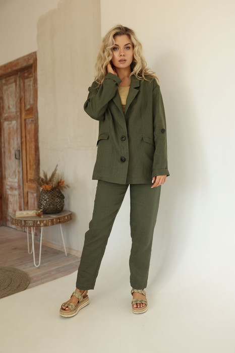 Натуральные льняные штаны в спортивном стиле с боковыми карманами и поясом на широкой резинке.