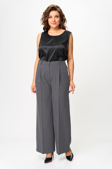 Брюки классические, со стрелками, полной длины, выполнены из однотонной ткани. В области бедер полуприлегающие, в колене и по низу прямые. По передним половинкам обработаны складки по линии талии и наклонные карманы, в среднем шве застежка на молнию. По задним половинкам обработаны талиевые вытачки. Брюки на притачном поясе с эластичной тесьмой и застежкой на петлю и пуговицу.