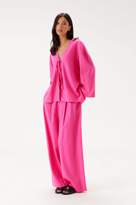 Брюки свободного кроя. Выполнены из льняного полотна розового цвета. Пояс по переду стабильный, пояс по спинке на резинке. По переду от пояса складки. В боковых швах карманы с отрезным бочком. По заднему полотну накладные клапаны (имитация карманов). Застёжка центральная молния, пуговица. Длина по боковому шву 102 см.