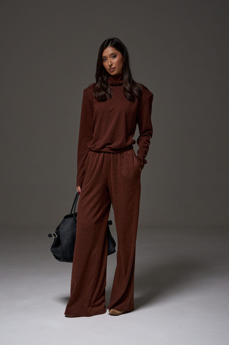 Брюки прямого свободного кроя, выполены из трикотажного полотна в шоколадном оттенке. Характеристики: прямой крой, узкий пояс на резинке с кулиской, в боковых швах карманы. Длина по боковому шву 105см.