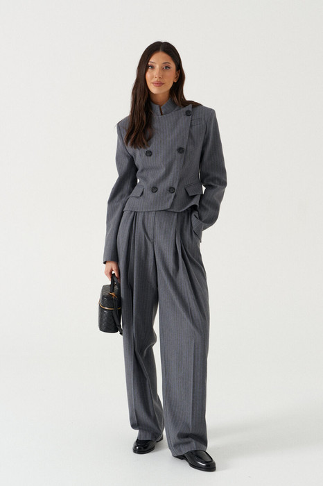 Брюки свободного кроя, выполнены из текстильной, чуть ворсистой, ткани. Характеристика: свободный крой, пояс частично на резинке, застежка центральная на пуговицу и замок, скрывающийся под гульфиком, спереди есть защипы, без подкладки, в боковых швах карманы. Длина изделия по боковому шву 112см.
