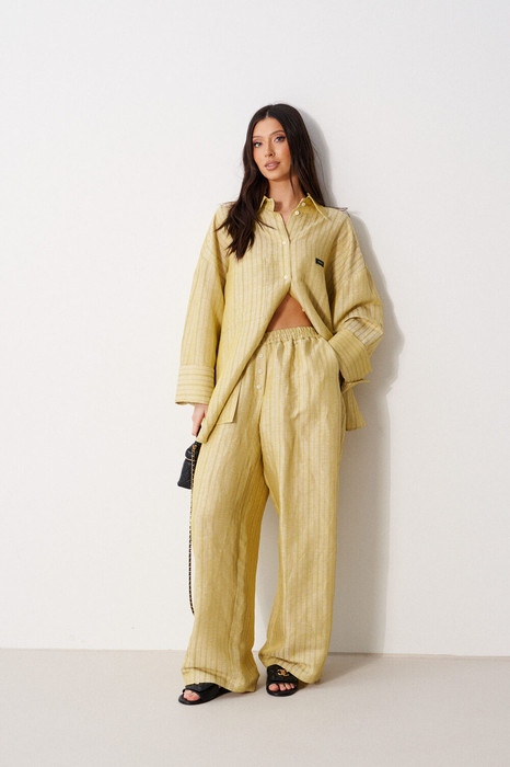 Брюки свободного кроя, выполнены из хлопкового полотна оливкового цвета в узкую полоску. Характеристика: свободный крой, пояс на резинке, имитация гульфика с пуговицами, в боковых швах карманы, сзади изделия накладные функциональные карманы. Длина по боковому шву 107 см.