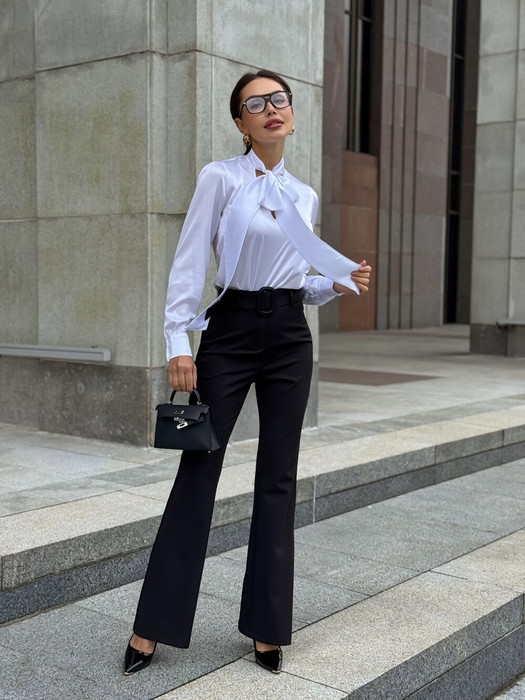 Брюки классические, по форме прямые, клешенные от лиии колена, застежка - потайная молния. Съёмный пояс из основной ткани, обработан пряжкой - в комплекте