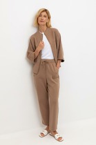 Брюки классические, по форме прямые, клешенные от лиии колена, застежка - потайная молния. Съёмный пояс из основной ткани, обработан пряжкой - в комплекте