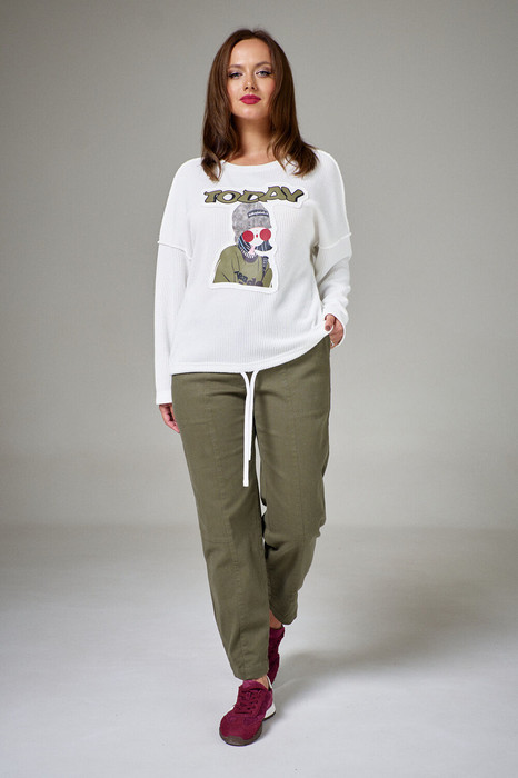 Брюки из хлопкового джинса со стрейчем длиной до косточки, силуэтной формы "бананы", с четырьмя функциональными карманами и одним декоративным. Передние и задние половинки брюк с вертикальными швами по центру. В боковой части, на уровне колена, горизотальные подезы. Ширина брюк по низ регулируетсяхлястикм с засежкой на пуговцу. Изделие декорировано хольнитенами и нашивками.