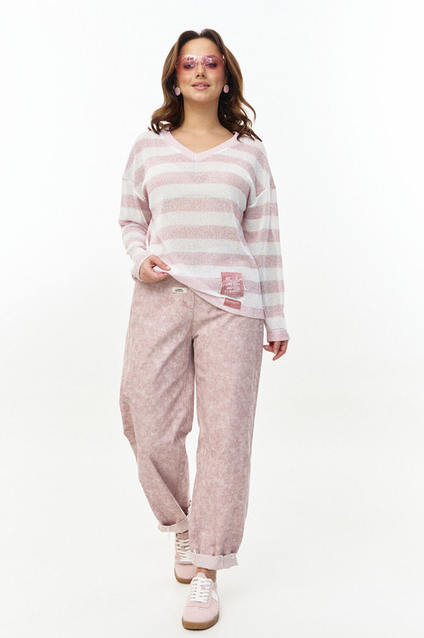 Джинсы из "мраморного" хлопка, с четырьмя функциональными карманами и поясом с резинкой на спинке. Боковые швы брюк переходят на перед. Изделие проходит энзимную стирку.