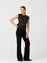 Брюки прямые, классические, с заутюженными стрелками, по переду обработаны карманы с отрезным бочком, застежка на тесьму-молнию и 1 пуговицу. На задних половинках обработаны вытачки и имитация карманов с листочкой, пояс в брюках притачной, по боковым швам резинка. Длина брюк от талии по боковому шву 103 см.