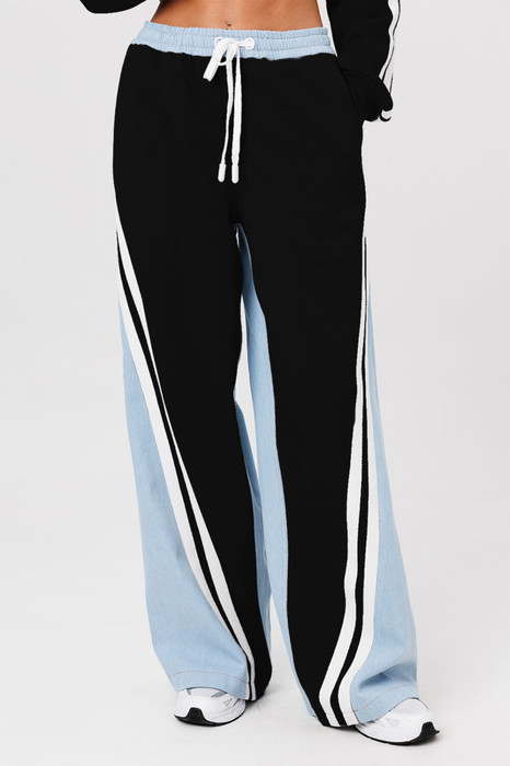 Брюки комбинированные (джинс + трикотаж), прямого силуэта на притачном отстроченном поясе на резинке и втянутым в него декоративным шнурком. По переду карманы в боковых швах с наклонным входом, диагональные рельефы и настрочены широкие лампасы вдоль рельефа. Спинка с накладными карманами.