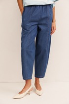 Брюки немного расширенные к низу, на притачном, отстроченном поясе на резинке, с карманами в боковых швах. Вверху по переду имитация застежки-гульфик.