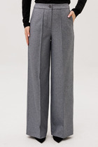 Брюки – из полотна с набивным рисунком в полоску, слегка зауженные книзу, с эластичной тесьмой по талии и притачными манжетами по низу. В центре переда по верхнему срезу прикреплен небольшой декоративный бантик из узкой атласной ленты.