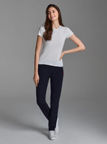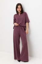Брюки – из полотна с набивным рисунком в полоску, слегка зауженные книзу, с эластичной тесьмой по талии и притачными манжетами по низу. В центре переда по верхнему срезу прикреплен небольшой декоративный бантик из узкой атласной ленты.