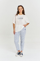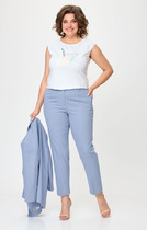 Брюки – укороченные, на притачном поясе с эластичной тесьмой внутри и карманами в боковых швах. На нижних частях передних половин застрочено по две вертикальных складочки-защипа.