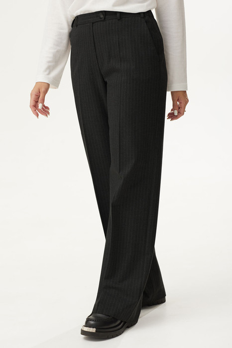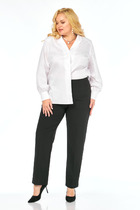 Брюки актуального кроя, прямого силуэта, выполнены из костюмной ткани с вискозой. Верх оформлен притачным поясом с застежкой на петлю-пуговицу, резинкой по бокам и шлевками. Перед с карманами и заутюженными «стрелками».