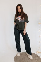 Брюки  выполнены из костюмной ткани с рисунком "гусиная лапка", слегка заужены к низу, в наружных боковых швах выполнены разрезы. Карманы в боковых швах. Застежка спереди на молнию. Пояс широкий со шлевками.  Пояс с обтяжной пряжкой идет в комплекте.
