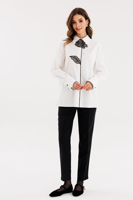 Брюки выполнены из однотонной костюмной ткани, заужены к низу, на задних половинках карманы с листочкой, застежка в боковом шве на металлическую молнию и пуговицу. По низу в боковом шве разрезы.