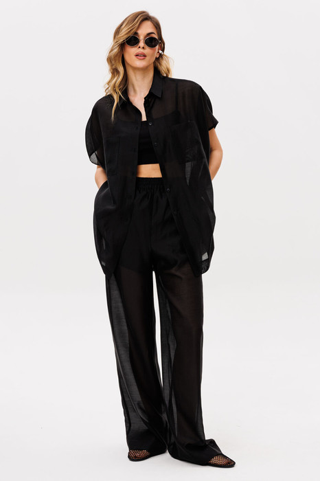 Брюки выполнены из плательно-блузочной ткани. Брюки прямого силуэта, на притачном поясе с эластичной тесьмой. Спереди боковые карманы с наклонным входом.